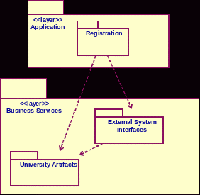 в слой Business Services, помимо подсистем, включены еще два пакета: пакет External System Interfaces включает интерфейсы подсистем (классы со стереотипом <<Interface>>), а пакет University Artifacts – все классы-сущности.