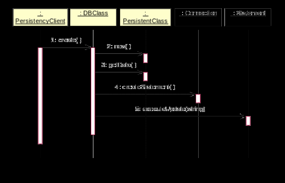 Из диаграммы видно, что для создания новых данных (нового экземпляра устойчивого класса) экземпляр клиентского класса PersistencyClient запрашивает DBClass. DBClass создает новый экземпляр PersistentClass, запрашивает начальные значения его атрибутов (записанные конструктором). Затем DBClass создает новый оператор SQL, используя операцию createStatement() класса Connection. Этот запрос должен добавить новую запись в таблицу. В результате выполнения этого оператора SQL данные нового экземпляра устойчивого класса помещаются в БД.