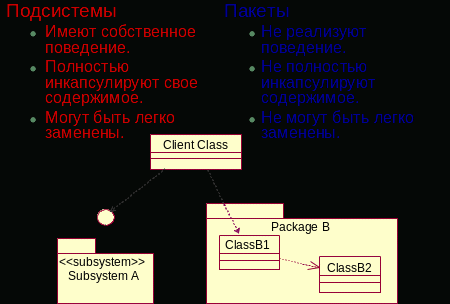 Заметим, что связь клиентского класса с подсистемой более гибкая, чем с пакетом, в том смысле, что изменения внутри подсистемы не затрагивают клиентский класс. Во втором случае изменения из пакета могут распространиться на клиента вдоль зависимости. Обратной стороной гибкости является такой неприятный факт – интерфейс должен быть стабильным. Любое изменение в интерфейсе затронет реализующую его подсистему (вдоль связи реализации), а также клиентский класс, которому требуется данный интерфейс (вдоль зависимости). Очень желательно сразу правильно описать интерфейсы!