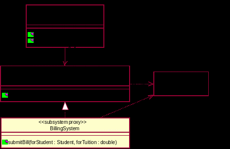 качестве примера (для системы регистрации) приведем подсистему BillingSystem, которая создана вместо граничного класса BillingSystem. Взаимодействие с ней осуществляется через объект-посредник класса BillingSystem, реализующего интерфейс iBillingSystem. На диаграмме показаны внешние связи подсистемы.