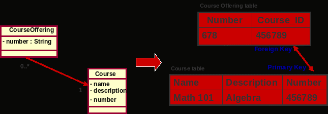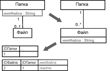 «* к *» – для ассоциации заводится отдельная таблица. Ее столбцы – внешние ключи для таблиц классов, связанных ассоциацией. Основной ключ – комбинация этих столбцов.