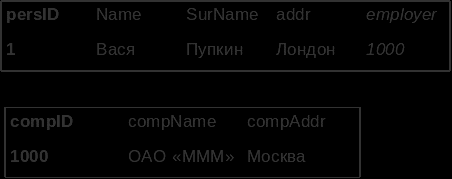 ервичные ключи: persID в 1-ой таблице, compID – во 2-ой. Внешний ключ – столбец employer 1-ой таблицы.