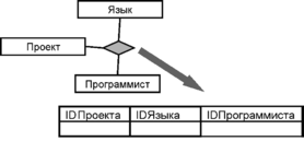 ребуется таблица для хранения связи. Например, в случае тернарной (N=3) связи формируются четыре таблицы, по одной для каждого класса и одна для связи. Таблица связи будет иметь среди своих атрибутов ключи каждой из 3х других таблиц.