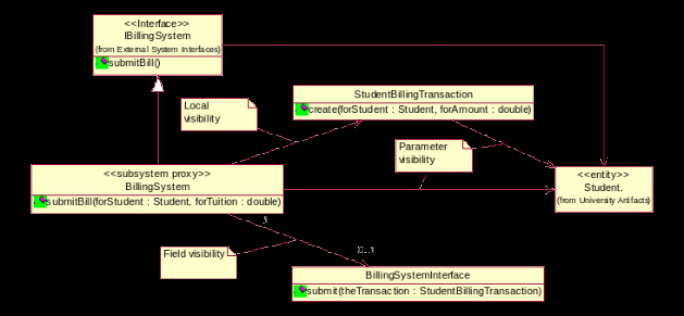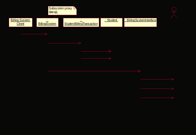 В системе регистрации ВУЗа для подсистемы BillingSystem создается фасад BillingSystem, реализующий единственную операцию submitBill интерфейса подсистемы IBillingSystem.