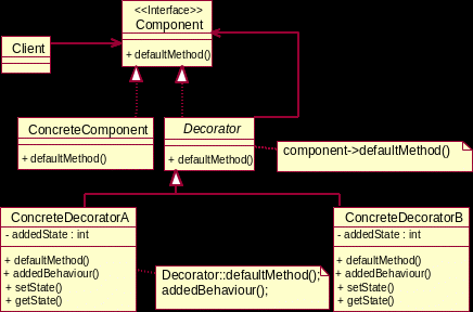 Decorator – декоратор, ссылающийся на декорируемый объект и определяющий интерфейс для декораторов, соответствующий интерфейсу Component;