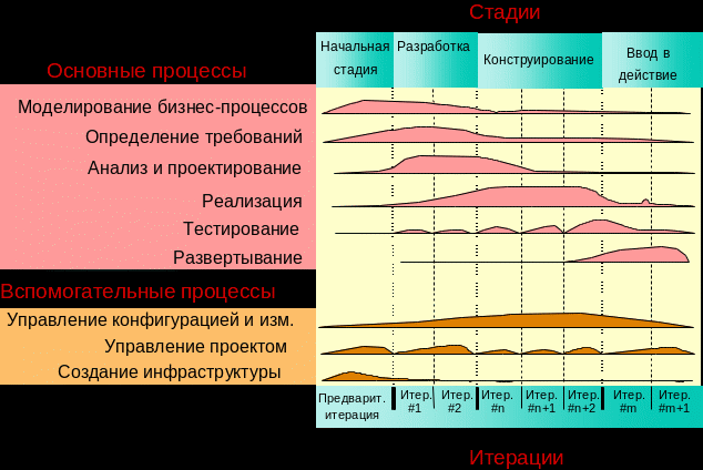 высота «горбов» в каждой точке проекта показывает интенсивность работ, выполняемых в рамках того или иного процесса ЖЦ.