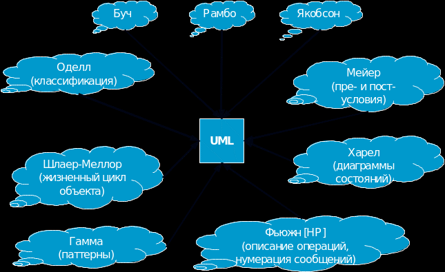 UML является наследником методов объектно-ориентированного анализа и проектирования, появившихся в конце 1980-х и начале 1990-х годов. Создание UML началось в конце 1994 г., с объединения методов Booch и OMT (Object Modeling Technique) под эгидой компании Rational Software. К концу 1995 г. Гради Буч и Джеймс Рамбо создали первую спецификацию Unified Method, версия 0.8. Тогда же в 1995 г. к ним присоединился создатель метода OOSE (Object-Oriented Software Engineering) Ивар Якобсон. UML является унификацией методов Буча, Рамбо и Якобсона а также суммой передового опыта по разработке ПО: