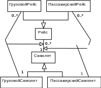 Обобщение рассматривается не только для классов, но и для ассоциаций. В этом случае стрелка обобщения соединяет две ассоциации. Заметим, что в моделях такое встречается редко. Ниже приведен пример, когда связь между рейсом и самолетом переопределяется в классах наследниках связью-наследницей.