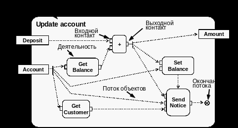 ак уже говорилось, диаграммы деятельности интерпретируются в соответствии с формализмом сетей Петри. Начальная точка порождает один курсор управления (или маркер) для каждого исходящего перехода. Если для ребра определено событие, то курсор достигает конца ребра только после наступления такого события. Ограничивающее (сторожевое) условие также определяет, возможно ли перемещение курсора по ребру. При попадании курсора в узел действия происходит ожидание курсоров на всех входящих ребрах и лишь потом запускается единица работы. По завершении выполнения работы генерируются курсоры на всех исходящих ребрах. При попадании в узел разветвления (он имеет один вход и несколько выходов) курсор проходит дальше лишь по тому ребру, для которого выполнено сторожевое условие (вообще говоря, лучше когда оно одно, если несколько – произвольно выбирается единственное для передачи курсора). При попадании в узел объединения курсор из любого входа копируется на выходе (единственном). При попадании в узел разделения курсор дублируется на все выходы одновременно (происходит распараллеливание). Синхронизация обеспечивается узлом слияния, где происходит ожидание курсоров на всех входах и лишь затем выдается курсор на выходе. При попадании курсора в любой финальный узел вся деятельность, описываемая диаграммой, прекращается. Примерно по тем же правилам перемещаются курсоры объектов. Узлы действия могут иметь входные и выходные контакты для приема/выдачи курсоров объектов, изображаемые в виде квадратиков на границе узла. Если входных контактов несколько, действие в узле выполняется лишь тогда, когда на всех их пришли курсоры объектов. Пример: