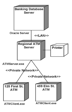 Диаграмма размещения отражает физические взаимосвязи между программными и аппаратными компонентами системы. Она является хорошим средством для того, чтобы показать размещение объектов и компонентов в распределенной системе. Ее основные элементы:
