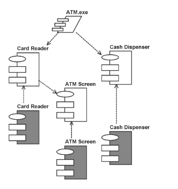 иаграммы компонентов моделируют физический уровень системы. На них изображаются компоненты ПО и связи между ними. На такой диаграмме обычно выделяют два типа компонентов: исполняемые компоненты и библиотеки кода. Каждый класс модели (или подсистема) преобразуется в компонент исходного кода. Между отдельными компонентами изображают зависимости, соответствующие зависимостям на этапе компиляции или выполнения программы. В модели системы может быть несколько диаграмм компонентов, в зависимости от числа подсистем или исполняемых файлов. Каждая подсистема является пакетом компонентов. Диаграммы компонентов применяются теми участниками проекта, кто отвечает за компиляцию и сборку системы.