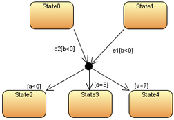 ля сокращения количества переходов иногда применяют переходные псевдосостояния (черный кружок). На исходящих из него стрелках не могут быть отмечены события. В примере справа заданы 6 переходов. Каждый обозначается 2мя стрелками. Сторожевые условия получаются логическим умножением. То есть, имеем 3 перехода из State0 по событию e2: в State2 со сторожевым условием [b<0 and a<0], в State3 со сторожевым условием [b<0 and a=5], в State4 со сторожевым условием [b<0 and a>7]. И 3 перехода из State1 по событию e1: в State2 со сторожевым условием [b<0 and a<0], в State3 со сторожевым условием [b<0 and a=5], в State4 со сторожевым условием [b<0 and a>7]. Переход не может остановиться в переходном псевдосостоянии. Действия, приписанные частям сложного перехода, выполняются последовательно.