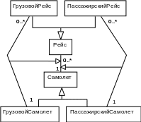 иаграмма содержит большое количество связей (ассоциаций и обобщений) необходимых для указания, что тип самолета должен соответствовать типу рейса, т. е. что пассажиров нельзя перевозить грузовым самолетом. Это ограничение можно зафиксировать иначе, упростить диаграмму, сделать ее более наглядной: