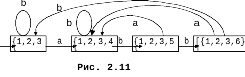 алгоритма приведена на рис. 2.10. В результате будет построен детерминированный конечный автомат, изображенный на рис. 2.11. Состояния автомата обозначаются как множества позиций, например {1,2,3}, конечное состояние заключено в квадратные скобки [1,2,3,6].