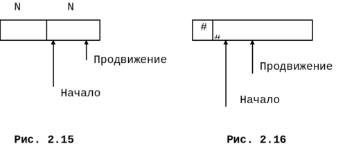 Чтобы не читать каждый символ отдельно, в каждую из половин буфера одной командой чтения считывается N символов. Если на входе осталось меньше N символов, в буфер помещается специальный символ (eof). На буфер указывают два указателя: продвижение и начало. Между указателями размещается текущая лексема. Вначале они оба указывают на первый символ выделяемой лексемы. Один из них, продвижение, продвигается вперед, пока не будет выделена лексема, и устанавливается на ее конец. После обработки лексемы оба указателя устанавливаются на символ, следующий за лексемой. Если указатель продвижение переходит середину буфера, правая половина заполняется новыми N символами. Если указатель продвижение переходит правую границу буфера, левая половина заполняется N символами и указатель продвижение устанавливается на начало буфера.
