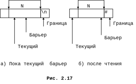 В третьей схеме используются три указателя (рис. 2.17). Непросмотренная часть буфера заключена между текущим и границей (граница - это указатель на последний элемент буфера). Анализ очередной лексемы начинается после сканирования незначащих пробелов. Если после этого текущий указывает на '#' в конце буфера, делается перезагрузка буфера (предполагается, что '#' не может входить в состав лексемы). Барьер выбирается таким образом, чтобы между барьером и границей всегда помещалась любая лексема. Если начало очередной лексемы оказывается правее барьера, то часть буфера от текущего до границы переписывается левее буфера и буфер перезагужается. Тем самым начало лексемы конкатенируется с ее концом. Так обрабатывается ситуация, когда граница буфера прошла через лексему.