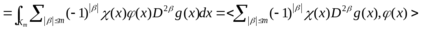 Ранее мы доказали, что имеем , значит такое, что , где - это элемент исчерпания ( ). Возьмем с компактным носителем в (т.е. ) такую, что на . Далее можем считать, что из представления (**) равна нулю вне (т.к. по определению носителя равна нулю вне ). Можем считать, что достаточно большое для того, чтобы все функции из соболевского пространства были непрерывны. Значит, . Теперь мы можем интегрировать по частям, т.к. : (***). Осталось заметить, что поскольку и на , то в конечном представлении (***) можно убрать. Следовательно, . ЧТД