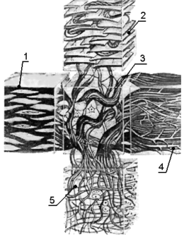 1 – плотная неоформленная соединительная ткань (дерма), 2 – плотная оформленная коллагеновая соединительная ткань (сухожилие), 3 – плотная оформленная коллагеновая соединительная ткань (роговицы глаза), 4 – рыхлая соединительная ткань,