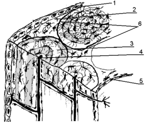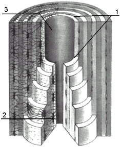 | Рис. 12 Строение костной ткани 1 – надкостница, 2 – наружные генеральные пластинки, 3 – остеон, 4 – гаверсов канал, 5 –внутренние генеральные пластинки, 6 – вставочные пластинки. | Рис. 13 Строение остеона 1 - цилиндр остеона; 2 - остеоциты; 3 - канал остеона |