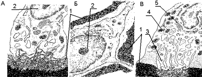 1 – межклеточное вещество, 2 – ядро, 3 – лизосома, 4 – митохондрии, 5 – комплекс Гольджи.