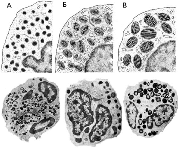 видимые в световой микроскоп – это лизосомы с гидролитическими ферментами; и мелкие гранулы, видимые только в электронный микроскоп, заполненные бактерицидными веществами.