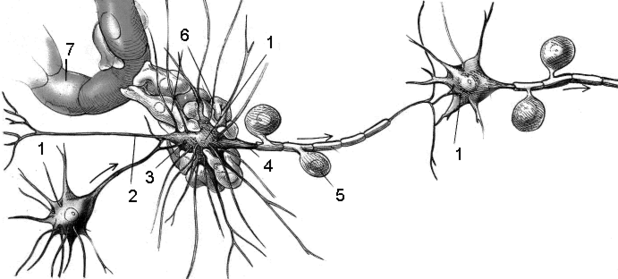 1 - тело нейрона, 2 – дендрит; 3 – синапсы, 4 – аксон; 5 – олигодендроглия;