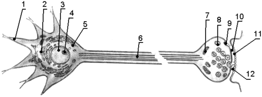 6 – аксон, 7 – митохондрии, 8 – синаптические пузырьки, 9 – синапс, 10 – синаптическая щель, 11 – постсинаптическая мембрана, 12 – нейромедиатор