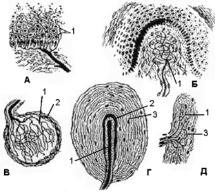 В - колбу Краузе (холод), Г - тельце Фатера-Пачини (давление), Д – тельце Руффини (тепло). 1 – нервные терминали,