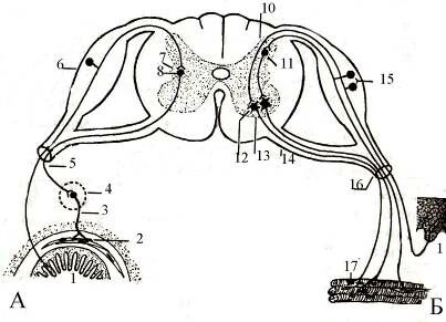 6 – спинальный ганглий, 7 – боковые рога спинного мозга, 8 – вставочный нейрон вегетативного ганглия, 9 – задняя срединная борозда, 10 – задние рога спинного мозга, 11 – тело вставочного нейрона, 12 – тело двигательного нейрона, 13 – передние рога спинного мозга, 14 – передние корешки спинного мозга, 15 – тела чувствительных нервных клеток, 16 – спинномозговой нерв, 17 – двигательное нервное окончание.