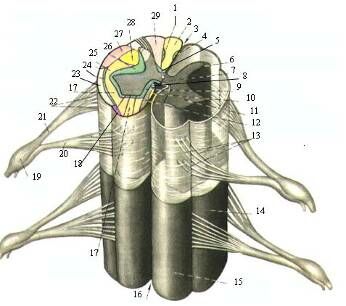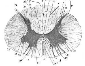 1 – задняя срединная борозда, 2 - задняя перегородка, 3 – задняя серая спайка, 4 – задняя промежуточная борозда, 5 – промежуточная перегородка, 6 - шейка, 7 – головка, 8 – верхушка, 9 – задний столб, 10 – боковой столб, 11 – передний столб, 12 – центральный канал, 13 – передняя серая спайка, 14 – передняя белая спайка, 15 – передний пучок, 16 – передняя срединная щель, 17 – передний рог, 18 – перед-ние корешки, 19 – нити передних корешков, 20 – боковой рог, 21 – ретикулярная формация, 22 – латеральный пучок, 23 – задняя латеральная борозда, 24 – задний корешок, 25 – задний рог, 26 – клиновидный пучок, 27 – тонкий пучок,
