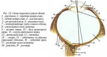 Глазное яблоко (диаметр 2,5 см) имеет три оболочки: фиброзную, состоящую из склеры и роговицы; сосудистую, с ее компонентами: собственно сосудистой оболочкой, реснитчатым телом и радужкой и внутреннюю (сенсорную) оболочку глазного яблока - сетчатку.