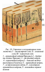 коре мозжечка различают три слоя: молекулярный, слой грушевидных клеток и зернистый. Самыми крупными нейронами коры мозжечка являются грушевидные клетки Пуркинье, аксон которых идет к подкорковым ядрам мозжечка, образуя начальное звено его эфферентных путей. В молекулярном слое локализованы тормозящие звездчатые и корзинчатые клетки. В зернистом слое различают клетки-зерна и большие звездчатые нейроны. Последние также являются тормозящими. Грушевидные клетки получают афферентные импульсы по моховидным и восходящим нервным волокнам. Восходящие передают импульс на дендриты грушевидных клеток. Моховидные волокна контактируют с дендритами клеток-зерен. Аксоны клеток-зерен поднимаются в молекулярный слой, там Т-образно делятся и идут параллельно поверхности извилины, образуя параллельные волокна. Параллельные волокна передают импульс на дендриты грушевидных клеток и одновременно на дендриты нейронов, которые тормозят грушевидные клетки, лежащие в соседних рядах. Таким образом, нейроны тормозящей системы коры мозжечка (звездчатые, корзинчатые, клетки зернистого слоя) препятствуют возбуждению грушевидных клеток и снимают тормозящее влияние последних на ядра мозжечка.