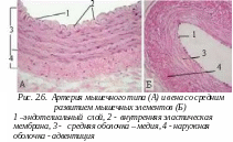 а) со слабым развитием мышечных элементов - это вены мелкого и среднего калибра (1-2 мм), сопутствующие артериям верхней половины туловища. Кровь в венах этого типа продвигается пассивно, под действием силы тяжести. Особенностью строения стенки является слабое развитие подэндотелиального слоя, небольшое количество пучков миоцитов в средней оболочке;