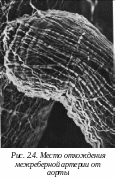Артерии эластического типа - аорта, в средней стенке которой преобладают эластические элементы. Кровяное давление в аорте составляет 120-130 мм. рт. ст., а скорость кровотока - 0,5-1,3 м/сек. Все три оболочки аорты имеют мощное развитие. Эндотелий представлен многообразными по форме и размерам клетками, подэндотелиальный слой, состоящий из рыхлой соединительной ткани с большим количеством звездчатых клеток и отдельными гладкомышечными клетками. На месте внутренней эластической мембраны - густое сплетение эластических волокон. В средней оболочке между окончатыми эластическими мембранами лежат косо расположенные гладкомышечные клетки.