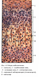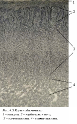 Снаружи надпочечники одеты толстой соединительнотканной капсулой. Главную массу паренхимы составляет корковое вещество, разделенное на три зоны: клубочковую, пучковую, сетчатую.