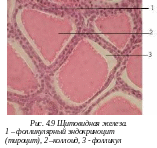 ри малом увеличении рассмотрите препарат «Щитовидная железа» , найдите компоненты стромы железы - соединительнотканную капсулу и септы, отдифференцируйте сосуды, проходящие в септе. Найдите фолликулы и при большом увеличении рассмотрите строение фолликулярных клеток * и по их форме, а также по характеру коллоида предположите функциональное состояние органа. Зарисуйте препарат.