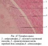 а препарате «Гипофиз кошки» при малом увеличении найдите переднюю долю, промежуточную и заднюю. При большом увеличении рассмотрите клеточные компоненты аденогипофиза, найдите хроматофобные и хроматофильные клетки *отметьте их соотношение. Среди хроматофильных клеток идентифицируйте оксифильные и базофильные клетки. В промежуточной зоне найдите полости - псевдофолликулы. При большом увеличении микроскопа рассмотрите заднюю долю, найдите ядра питуицитов и капилляры. Зарисуйте препарат.
