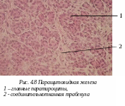 Околощитовидные железы выделяют гормон паратирин, повышающий уровень кальция в крови. Клетки околощитовидных желез - паратироциты располагаются тяжами скоплениями, разделенными прослойками соединительной ткани с сосудами. Различают главные паратироциты и ацидофильные клетки. Цитоплазма главных клеток, вырабатывающих гормон паратирин, содержит специфическую зернистость, ацидофильные клетки считаются стареющими. Эти клетки содержат капли липидов и не обладают секреторной активностью. При снижении уровняСа++ в крови повышается секреция околощитовидных желез.