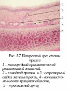 ри малом увеличении рассмотрите препарат «Трахея (поперечный срез)», изучите строение стенки трахеи и идентифицируйте ее оболочки по тканевому составу. Найдите слизистую оболочку, определите в ней респираторный эпителий и структуры соединительно-тканной пластинки, отметьте их структурные особенности, микроскопируя при большом увеличении. Изучите и зарисуйте строение слизистой, подслизистой, волокнисто-хрящевой и адвентициальной оболочек, отметьте их структурные особенности на рисунке.