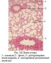 На препарате «Легкое» при малом увеличении научитесь определять структурные компоненты воздухоносных путей и респираторного отдела. По строению стенок идентифицируйте калибр бронхов. Определите, какие кровеносные сосуды находятся на срезе. При большом увеличении рассмотрите строение респираторного отдела, идентифицируйте терминальные и распираторные бронхиолы, рассмотрите и зарисуйте альвеолярный (респираторный) эпителий.