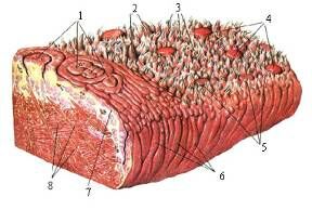1 – желобовидные сосочки, 2, 3 – нитевидные сосочки, 4 – грибовидные сосочки, 5 – спинка языка, 6 – боковая поверхность языка,