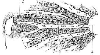 1 – ветвь воротной вены, 2 – желчный проточек, 3 – желчный каналец между гепатоцитами,