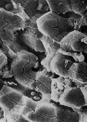 Рис. 6.15. Печень. Определяется сеть печеночных балок, между которыми располагаются синусоиды. На поверхности гепатоцитов видна система желчных полуканальцев (указано стрелками).