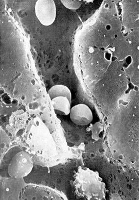 Рядом с междольковой артерией и веной проходит междольковый желчный проток, в который впадают желчные канальцы. Междольковая артерия, вена и желчный проток образуют печеночную триаду. Особенности строения синусоидного капилляра чрезвычайно важны для функции печени. Между эндотелиальными клетками имеются щели, базальная мембрана отсутствует, вокруг синуса имеется перисинусоидное пространство, в котором проходят отдельные пучки коллагеновых фибрилл. Между эндотелиоцитами лежат звездчатые клетки Купфера - макрофаги, фагоцитирующие микробов, поврежденные эритроциты и другие частицы. В перисинусоидальном пространстве располагаются особые липоциты, которые способны синтезировать коллаген и компоненты межклеточного вещества, накапливать липиды и витамин А.