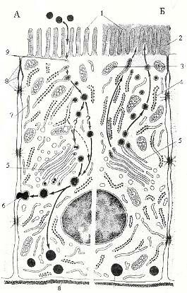 С какой из клеток эпителия сделана схема? Какие морфологические особенности в клетке можно отметить? Какова основная функция представленной клетки? Какие процессы отмечены стрелками А и Б?