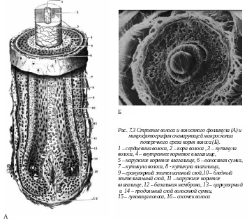 Волос подразделяется на корень и стержень. Корень - часть волоса, погруженная в кожу, стержень находится над ее поверхностью. Волос в центре имеет мозговое вещество, на периферии - корковое вещество и кутикулу. В пушковых волосах мозговое вещество отсутствует. Мозговое вещество построено из кубических или полигональных клеток, содержащих мягкий кератин, пигмент и пузырьки газа. Корковое вещество состоит из вытянутых в длину клеток, цитоплазма которых содержит твердый кератин, пузырьки газа и пигмент. Кутикула состоит из одного слоя плоских клеток, черепицеобразно накладывающихся друг на друга. Рост волос происходит за счет пролиферации малодифференцированных клеток волосяной луковицы, которые затем смещаются вверх и подвергаются ороговению. Питание волосяной луковицы осуществляется за счет соединительнотканного сосочка, включающего нервные окончания и кровеносные сосуды.