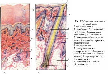 В зависимости от развития эпидермиса различают толстую кожу ладоней и подошв и тонкую, покрывающую остальную часть тела.
