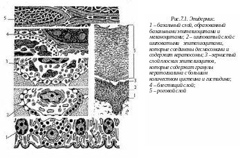 Эпидермис (многослойный ороговевающий эпителий), входящий в состав кожи, представлен пятью типами клеток (дифферонов). Эпидермальный дифферон состоит из пяти слоев кератиноцитов : базального, шиповатого, зернистого, блестящего и рогового. Второй дифферон представлен клетками Лангерганса, образующимися из моноцитов. Моноциты мигрируют через базальную мембрану и дифференцируются в дендритные клетки Лангерганса. Тела этих клеток находятся в шиповатом слое, а отростки проходят в зернистый и базальный слои. Клетки Лангерганса обновляются каждые шесть месяцев, выполняют фагоцитарную функцию и функцию антигенпредставительства.