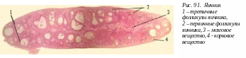 Яичник - парный орган, снаружи покрыт одним слоем поверхностного эпителия и состоит из коркового и мозгового вещества. Эпителиальные клетки имеют полигональную, кубическую или цилиндрическую форму, на своей поверхности несут микроворсинки. Покровный эпителий регулярно разрывается при овуляции, вслед за чем быстро пролиферирует и мигрирует, восстанавливая разрыв. Поэтому, вследствие высокой регенеративной активности, часто служит источником развития опухолей (60% всех новообразований яичника).