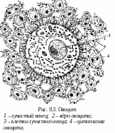 Прозрачная зона начинает формироваться в первичном фолликуле в виде дисперсных отложений нежно-волокнистого материала. Во вторичном фолликуле прозрачная зона представляет собой сетевидное образование, в которое проникают отростки фолликулярных клеток. В последующем в фолликулярном эпителии накапливается жидкость, появляется полость фолликула, формируется капсула - тека фолликула. Такой фолликул называется третичным или пузырчатым. Овоцит третичного фолликула покрыт прозрачной зоной. Лучистая зона окружает овоцит. Участок зернистого слоя, который занимает овоцит, называется яйценосным бугорком. В соединительнотканную капсулу фолликула врастают кровеносные сосуды и в ней различают два слоя: внутреннюю сосудистую теку и наружную - волокнистую. Во внутренней теке находятся текальные эндокриноциты, синтезирующие гормон - эстроген.